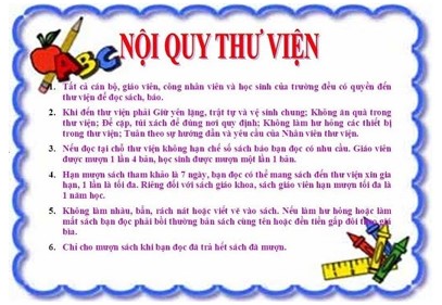 1. Vào thư viện phải giữ gìn trật tự, im lặng và giữ vệ sinh chung, tư trang, cặp sách để đúng nơi quy định.