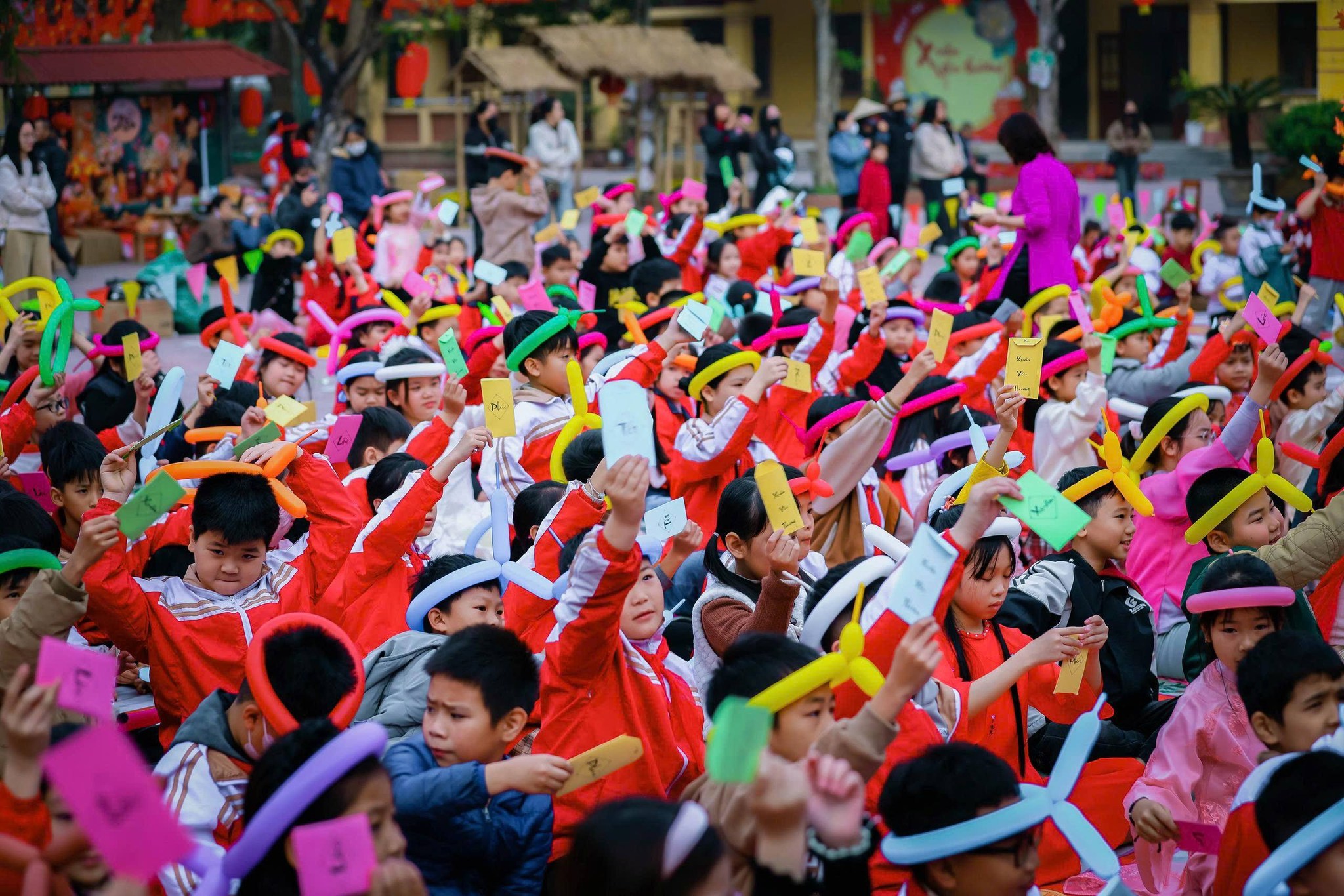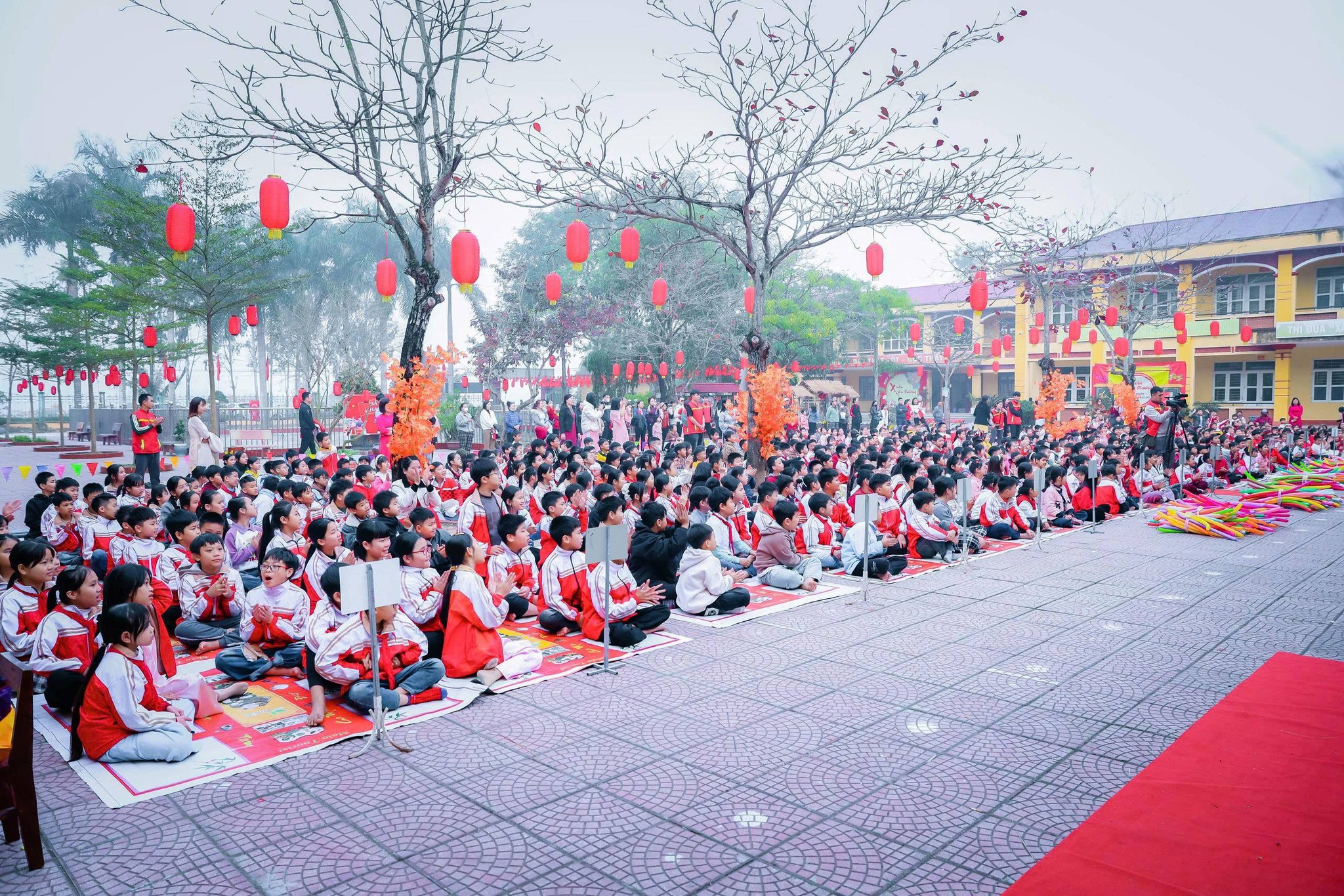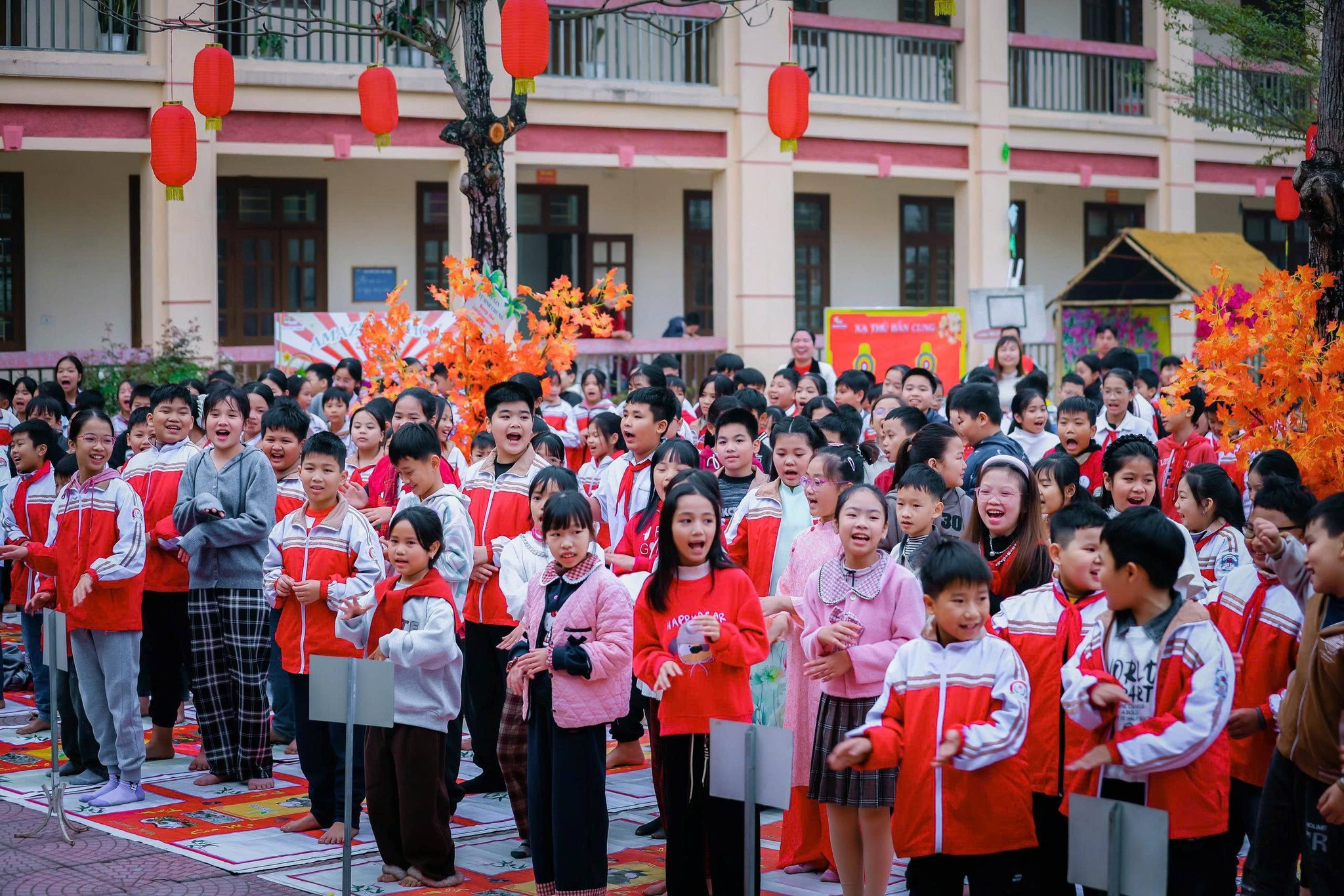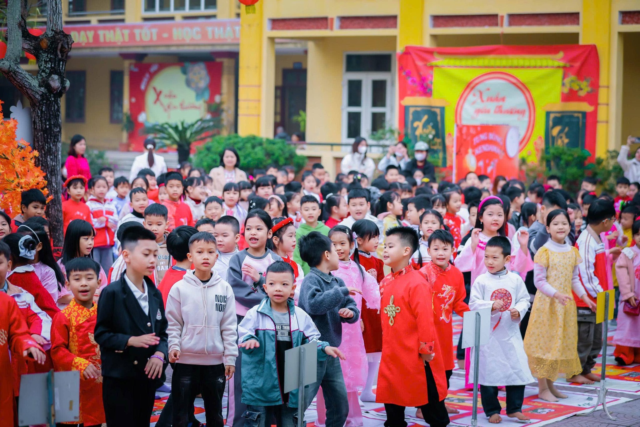 Sắc xuân ngập tràn ngôi trường nhỏ: Ngay từ cổng trường, không khí Tết đã lan tỏa với những hàng đèn lồng đỏ rực và băng rôn nổi bật. Sân trường được trang trí tỉ mỉ bằng những cây mai, cây đào khoe sắc thắm, cùng các gian hàng mang đậm nét văn hóa vùng quê Bắc Bộ. Mở đầu chương trình là màn múa lân sư rồng sôi động trên sân khấu chính. Tiếng trống hội rộn rã cùng những điệu múa uyển chuyển của lân và ông Địa đã thu hút sự chú ý của toàn thể học sinh. Tại ngày hội, các em học sinh được tham gia vào nhiều hoạt động thú vị: viết chữ thư pháp, gói bánh chưng, bánh tét, làm bao lì xì, tham gia vào các trò chơi dân gian, tập đi chợ tại các gian hàng chợ tết, …